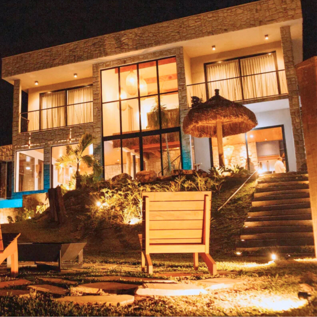 O destaque externo é o deck de madeira, onde a banheira de hidromassagem proporciona banhos relaxantes. Assim, desfruta-se de uma visão privilegiada do pôr do sol ou do céu estrelado do Cerrado, criando momentos únicos de conexão com a natureza.